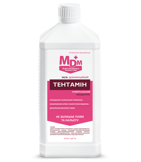 Склад дезінфікуючого засобу Тентамін: ГОД, Третинний амін, Допоміжні компоненти (відсотковий вміст субстанцій: N,N-біс3- амінопропілдодециламін 5 %, Алкілдиметилбензиламмоній хлорид АДБАХ 25 %, Алкілдиметилетилбензиламмоній хлорид 10 %, Діоктилдиметиламоній хлорид 5 %, Допоміжні компоненти)